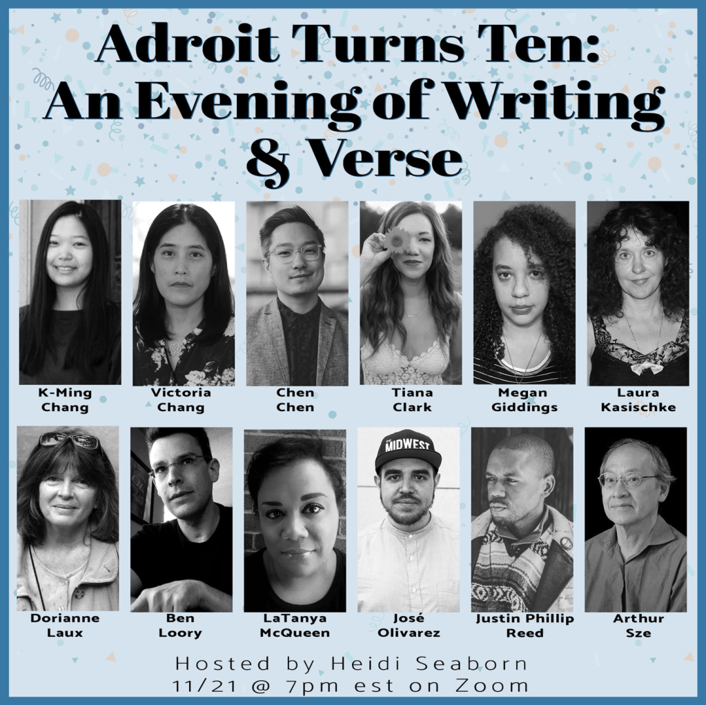 I’ll be reading a story on Zoom on Saturday, November 21st as part of the Adroit Journal 10th Anniversary Celebration. Other readers include K-Ming Chang, Victoria Chang, Chen Chen, Tiana Clark, Megan Giddings, Laura Kasischke, Dorianne Laux, LaTanya McQueen, José Olivares, Justin Phillip Reed, and Arthur Sze. The reading starts at 7:00pm Eastern / 4:00pm Pacific.