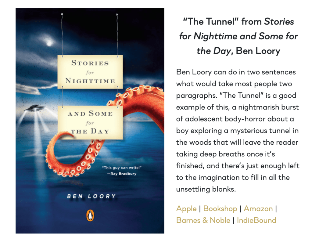I was delighted to find “The Tunnel” (from Stories for Nighttime and Some for the Day) mentioned in this article about short horror stories by Sam Reader over at TorNightfire.com. The list also includes the story “Fingers” by Rachael Heng, which appeared in last year’s Tiny Nightmares anthology, which also featured my story “Pictures of Heaven.” The list as a whole is a good one, too—can’t go wrong with Brian Evenson, The Twilight Zone, or Lisa Tuttle’s recently re-issued Nest of Nightmares! And I am officially adding Kevin Brockmeier’s The Ghost Variations to my TBR list.