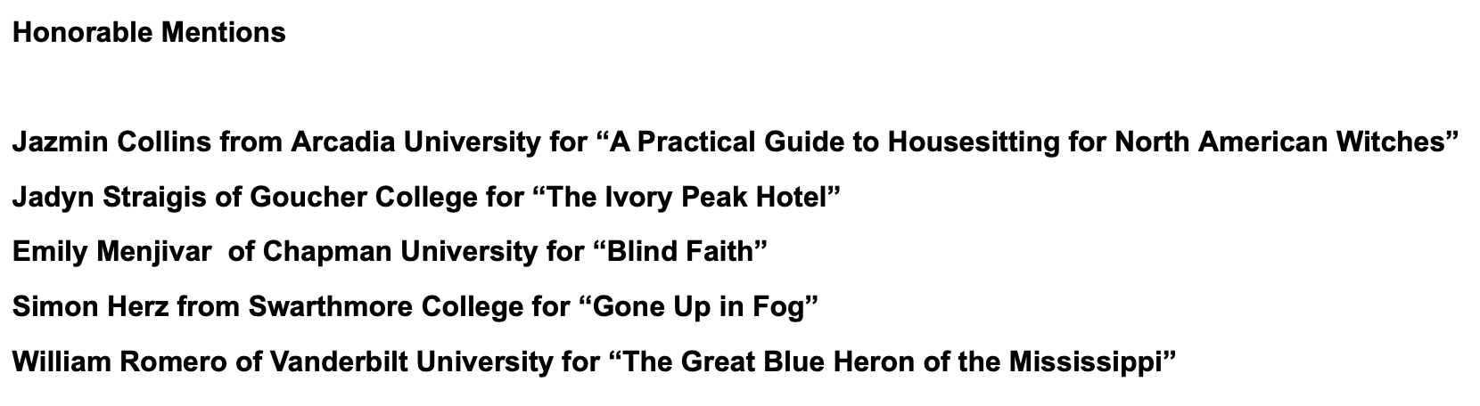 My student Sam Wilson won the Award outright for his story “blooming bleeding hearts.” Olivia Garcia was the first runner-up with her story “Of the Known Universe,” and Emely Menjivar was an Honorable Mention with her story “Blind Faith.”